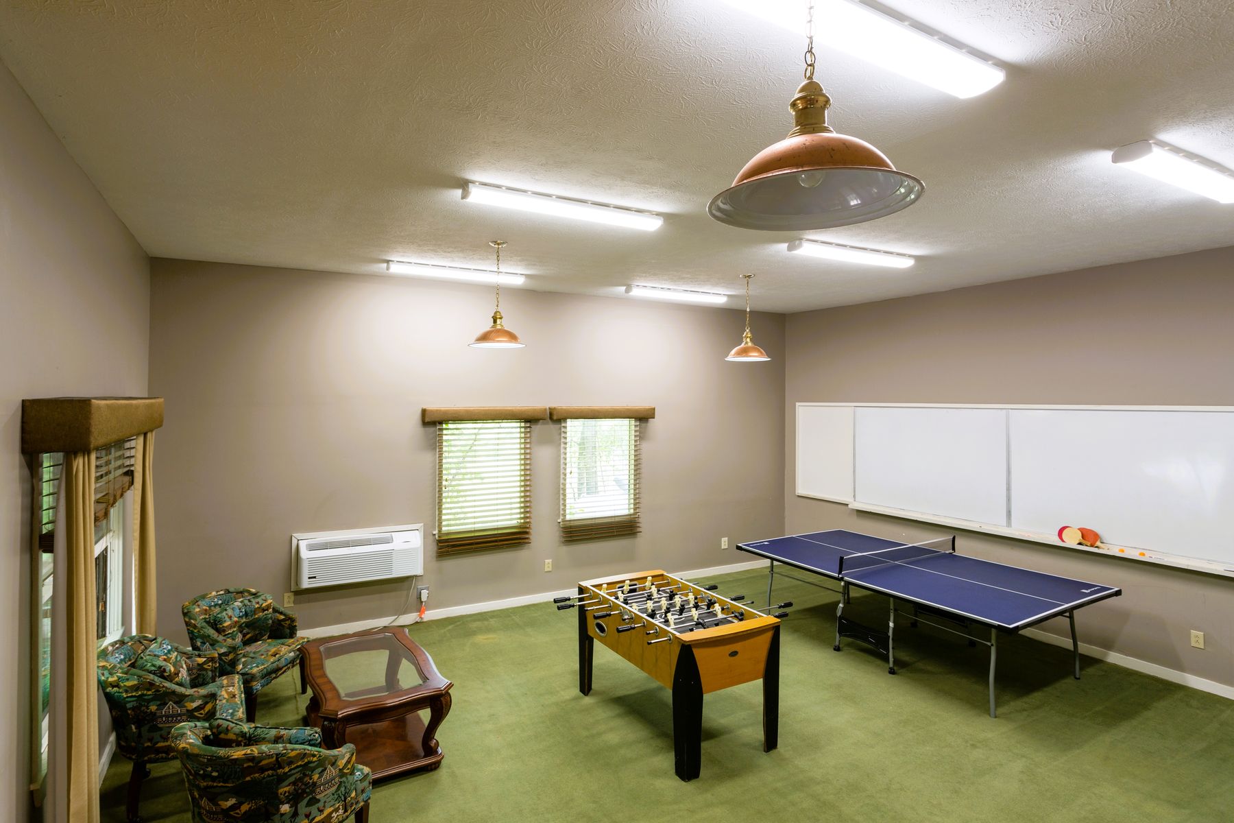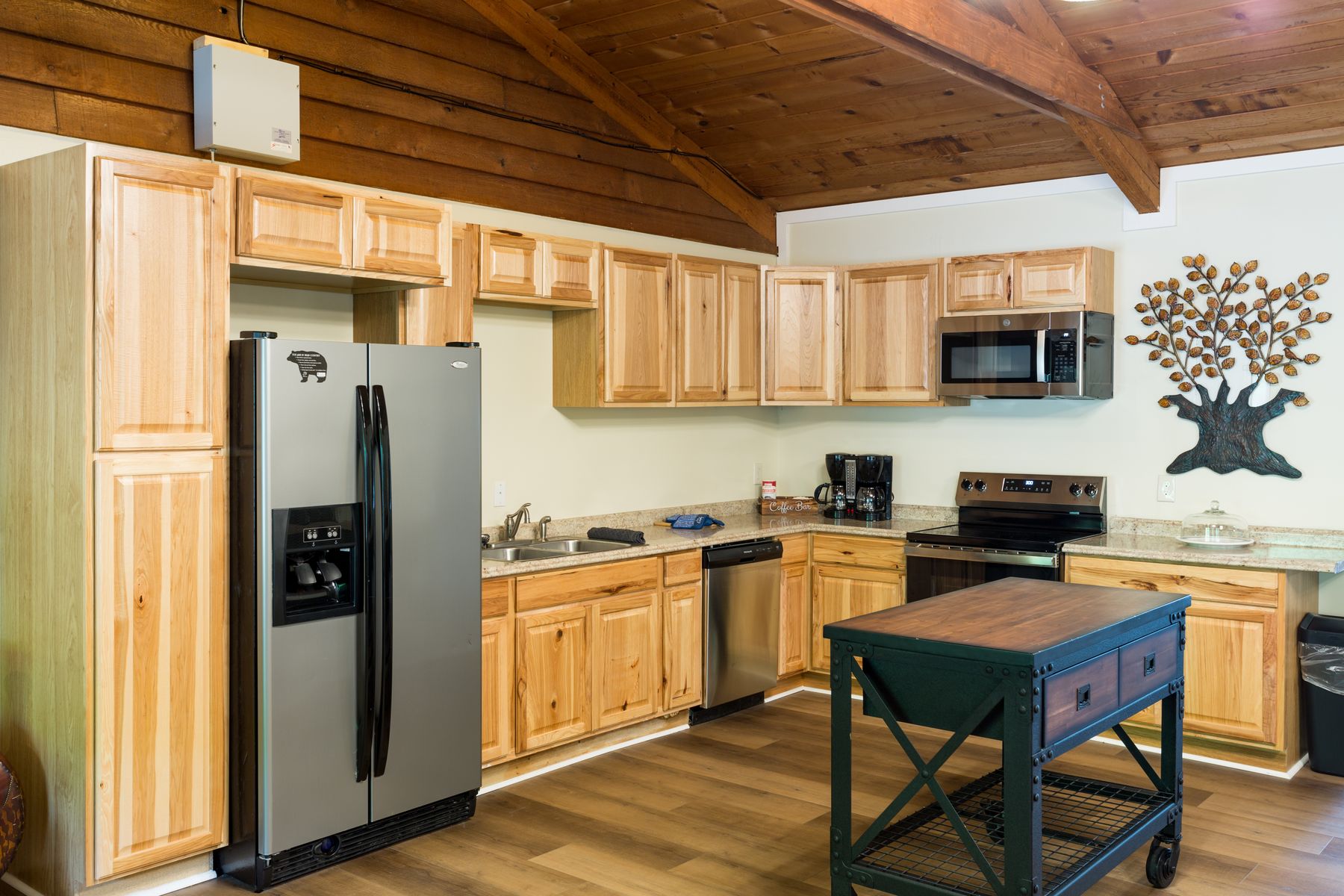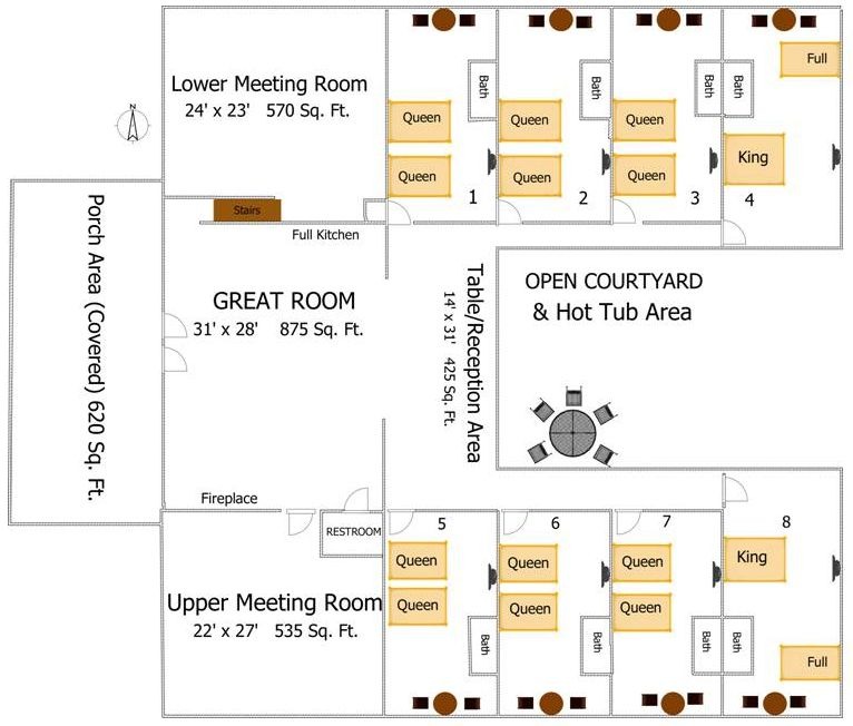 8 hotel rooms, each with 2 queen beds. Full kitchen, with hospitality area & private outdoor hot tub, plus meeting room and game room—ideal for group getaways. Total: 14 queen beds + 2 king beds. NO PETS