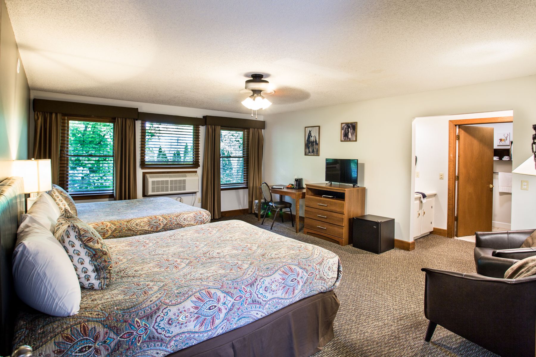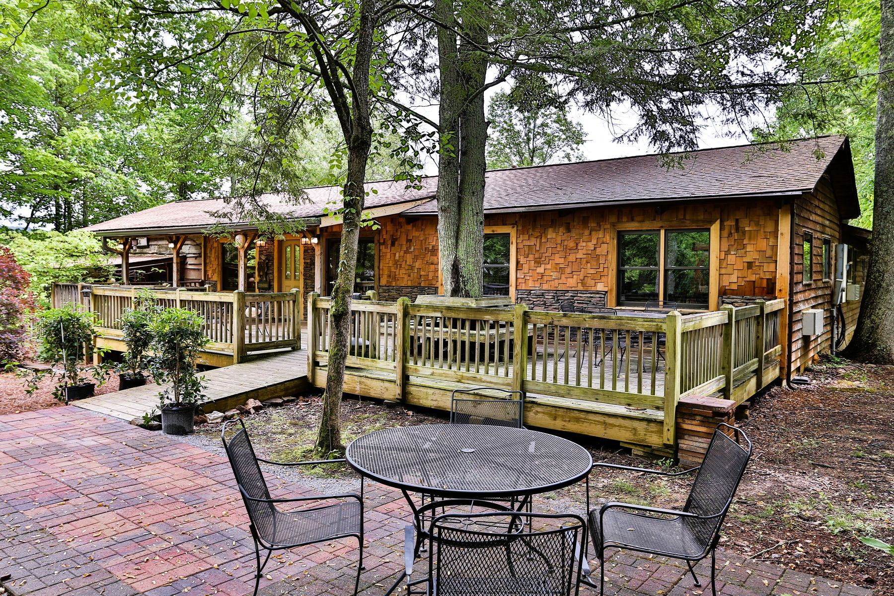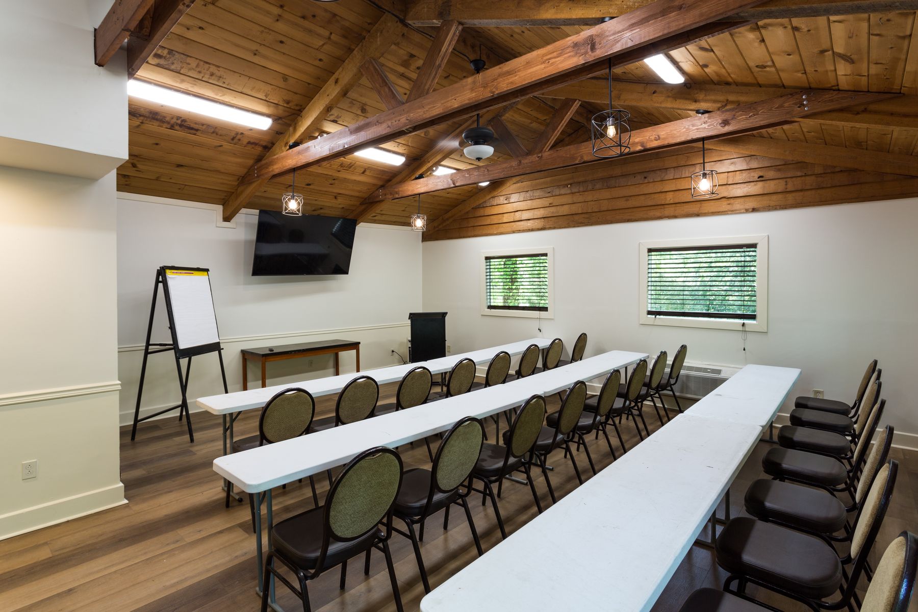 8 hotel rooms, each with 2 queen beds, plus hospitality room, & meeting space – Four large decks. Next to fire pit. Total: 16 queen beds. NO PETS