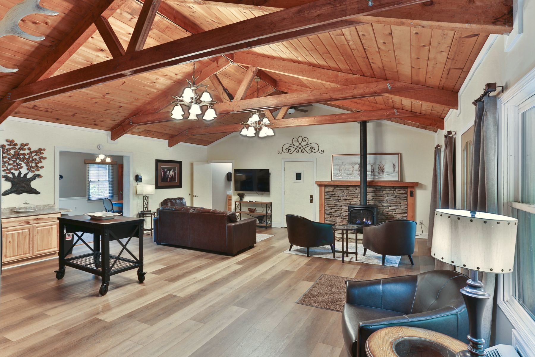 Perfect for small retreats, reunions, or multi-family vacations, Deer Trail Lodge offers 8 bedrooms, 8 bathrooms, and two bonus/meeting rooms for added flexibility. The hospitality suite features a full kitchen, cozy living area, and access to a private hot tub for relaxing after group activities. Each guest room is equipped with HBO, Showtime, WiFi, a private bath, and in-room conveniences like a coffee maker, refrigerator, and more. With 14 queen beds, 2 king beds, and 2 futon sofas, the lodge comfortably accommodates larger groups while maintaining comfort and privacy. The lodge also includes a sunroom, game room, and spacious dining and gathering areas—making it a go-to for group stays in the mountains. NO PETS