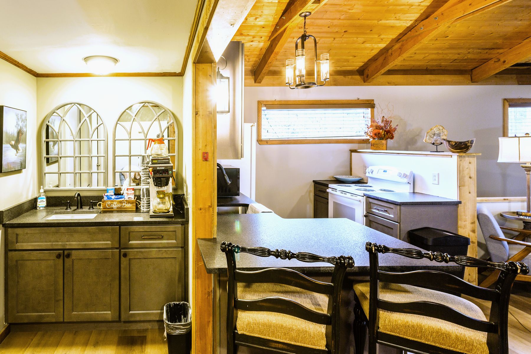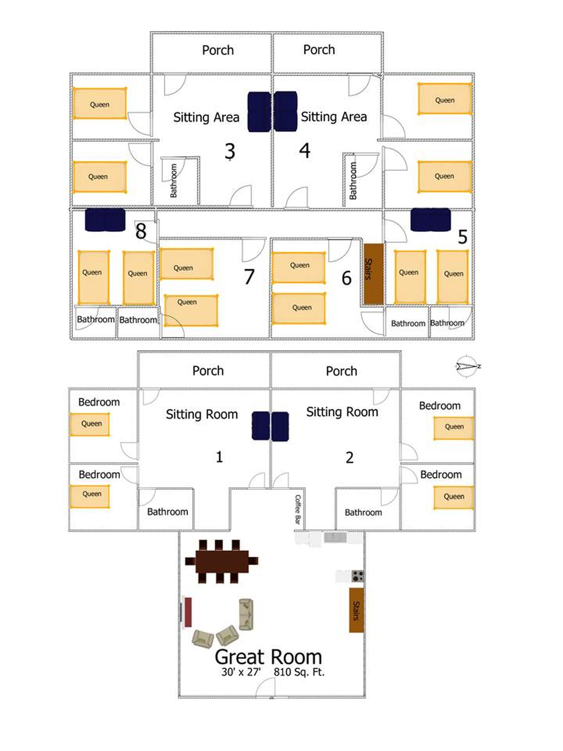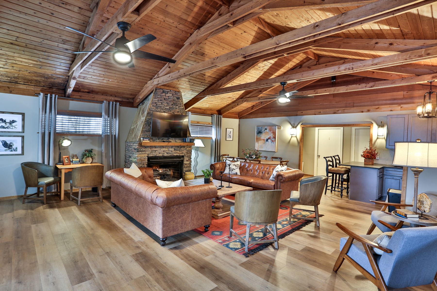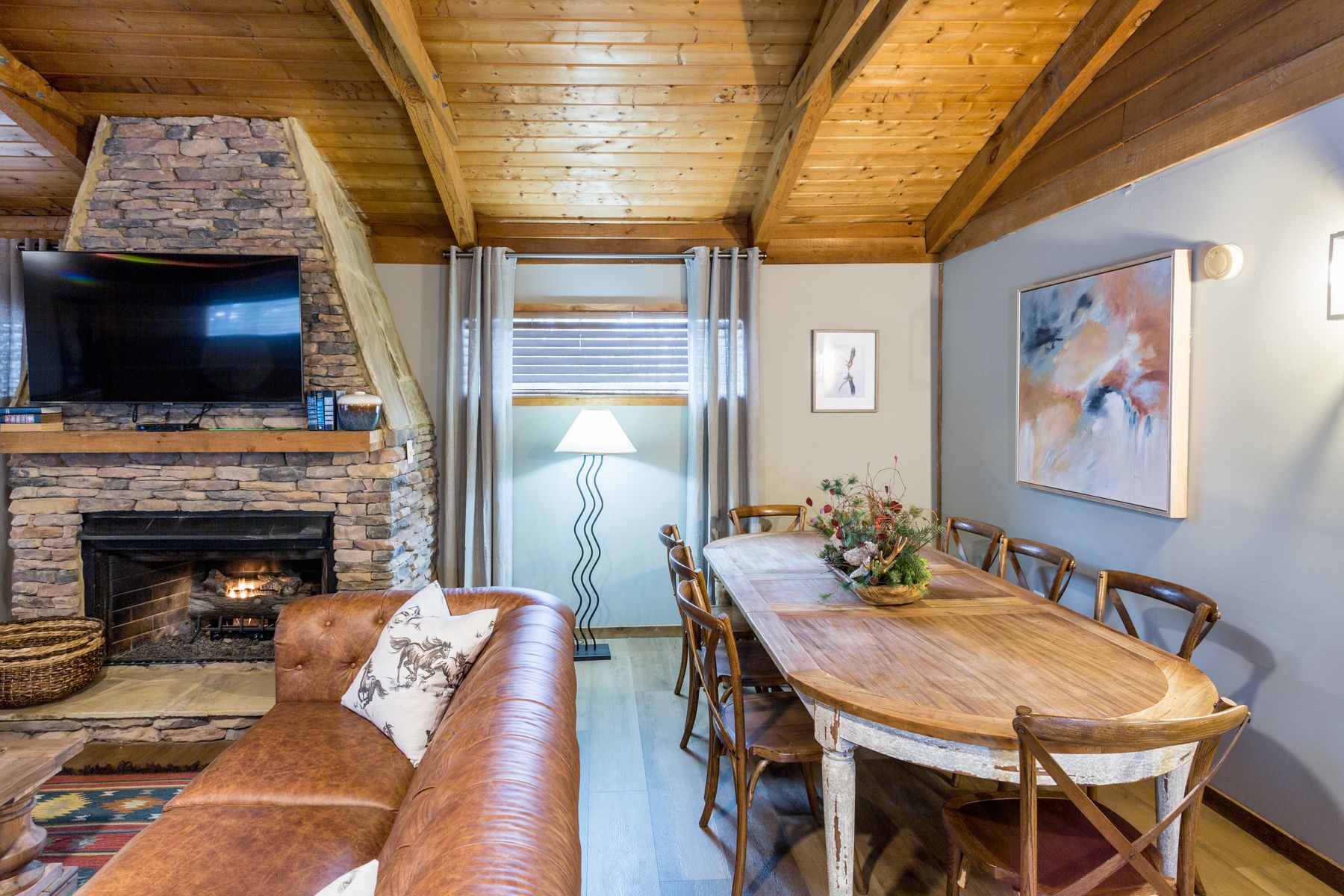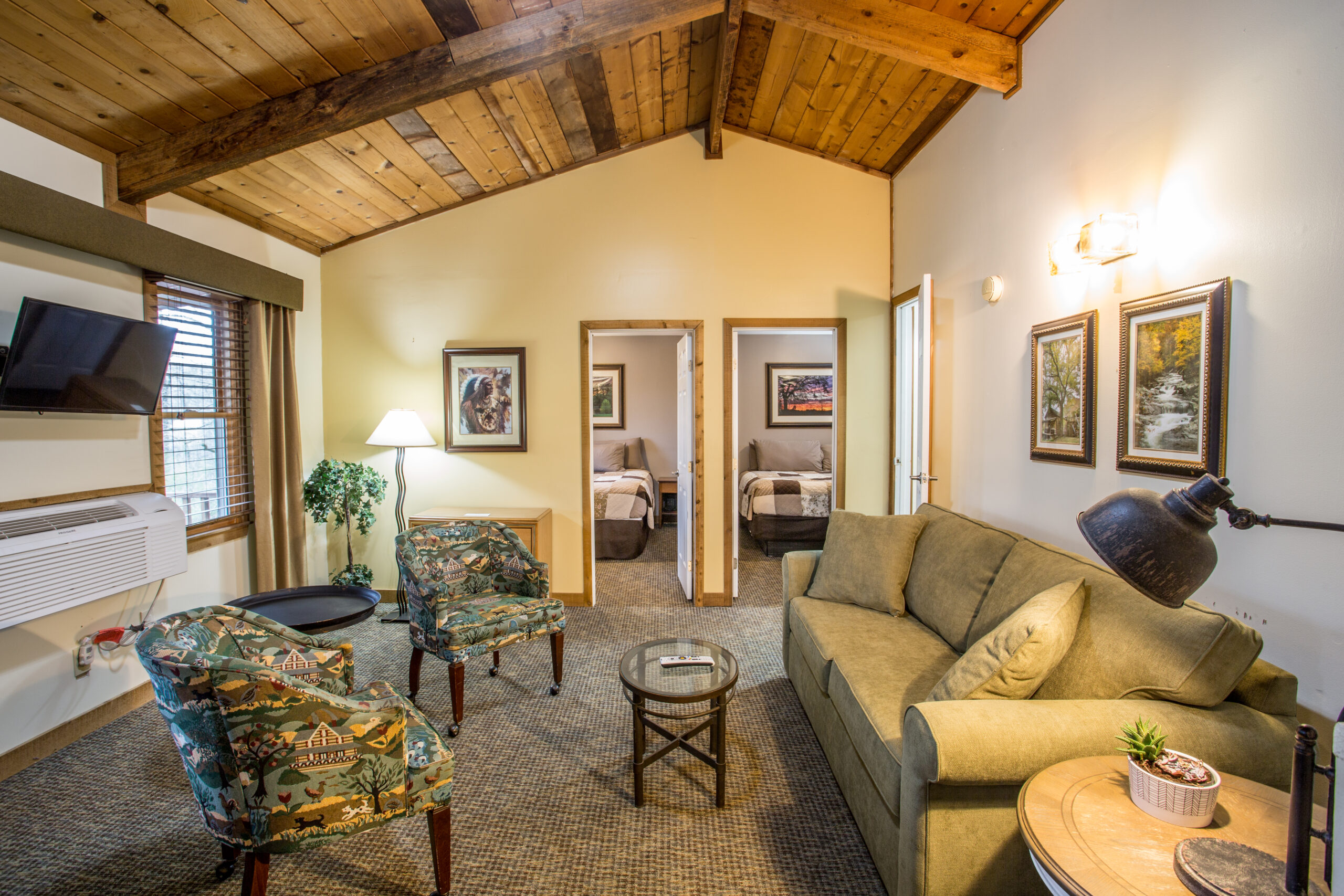 A favorite for family reunions and group getaways, Eagle’s Nest Lodge features 12 bedrooms and 8 bathrooms across a mix of spacious suites and standard rooms. The newly renovated hospitality suite (March 2024) offers a full kitchen, cozy fireplace, and comfortable gathering space. The lodge includes four two-bedroom suites—each with balconies, two king beds, and sleeper sofas—plus four standard rooms with two queen beds. Each space comes with HBO, Showtime, WiFi, full bath, and convenient amenities like irons, blow dryers, and more. Located near an outdoor hot tub and within walking distance of additional meeting space, Eagle’s Nest blends comfort, functionality, and a rustic mountain charm perfect for reconnecting with loved ones. NO PETS