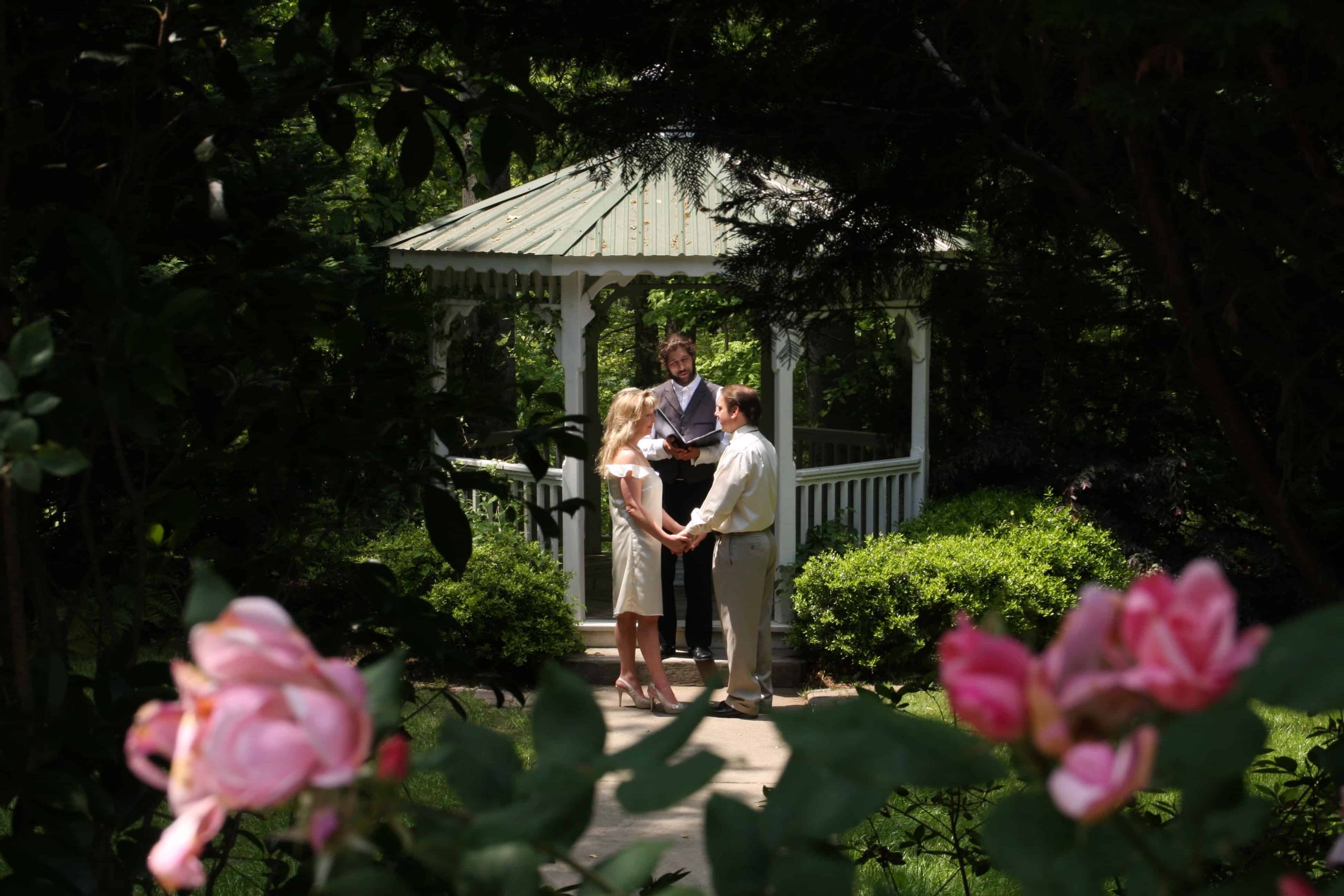 ELOPING?  WHAT TO EXPECT:  Getting married this way is just too easy!  Once your deposit is paid, we will schedule everything for you.  Simply put – the minister of ceremony (and photographer if hired) will arrive at the ceremony location at the expected time.  Bring your marriage license with you for the minister to sign.  You are typically not contacted by the minister or photographer prior to your ceremony.   If you wish to have music, you will need to bring it with you along with something to play it. Our wedding gardens are naturally pretty and do not require any additional decorations.  Punctuality is very important, as your minister of ceremony, ceremony location, carriage, or photographer may have other appointments that day. Additional fees will apply if you are late, and it may be possible that your minister or photography services might not be available and refunds cannot be issued.  Your champagne, flutes, and cake (if ordered) will be delivered to your room on the day of your arrival.  If you wish to have a live floral bouquet, please bring one with you.