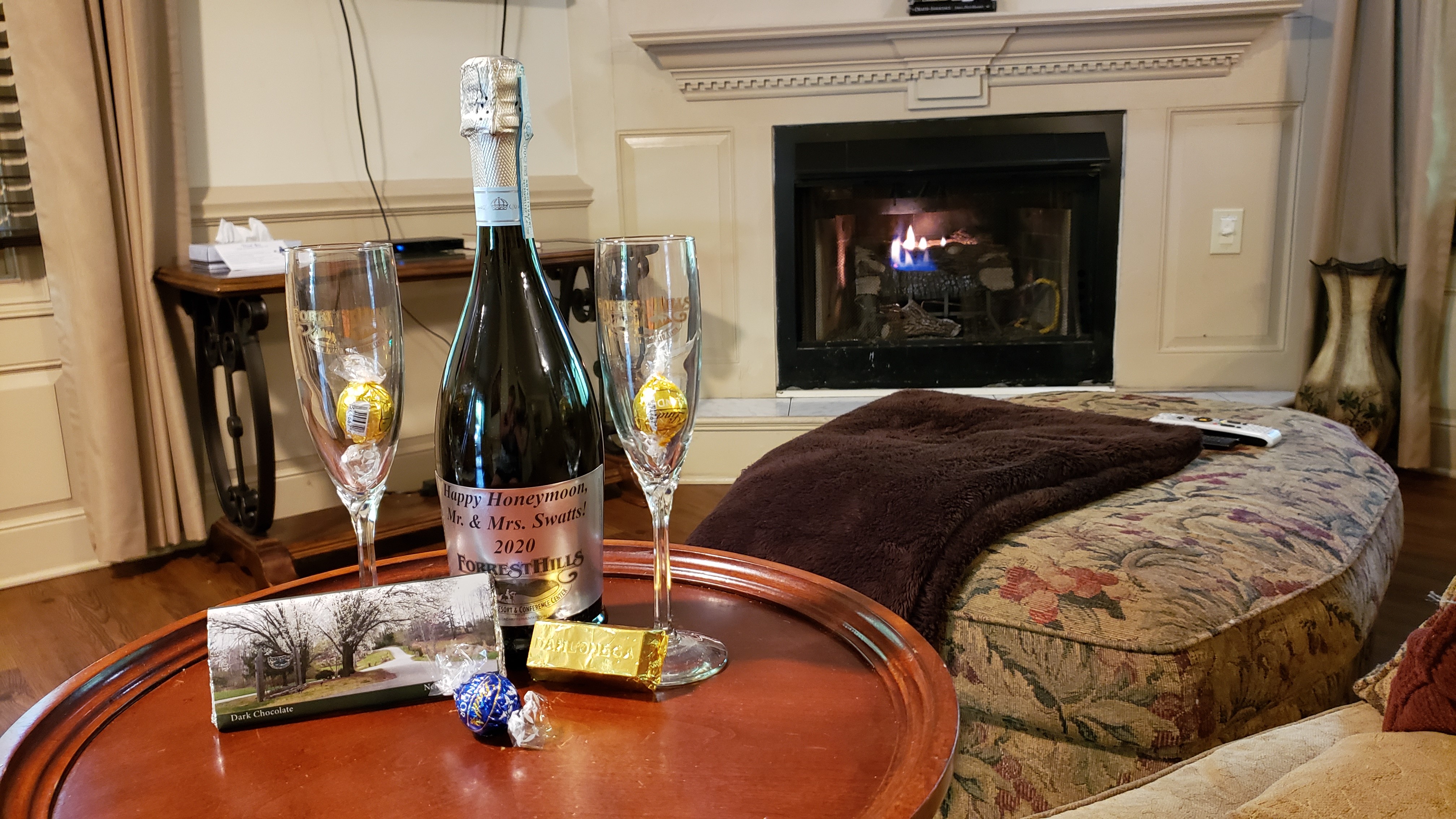 Unwind with your choice of champagne or non-alcoholic cider, locally made chocolates, and a pair of keepsake champagne flutes.