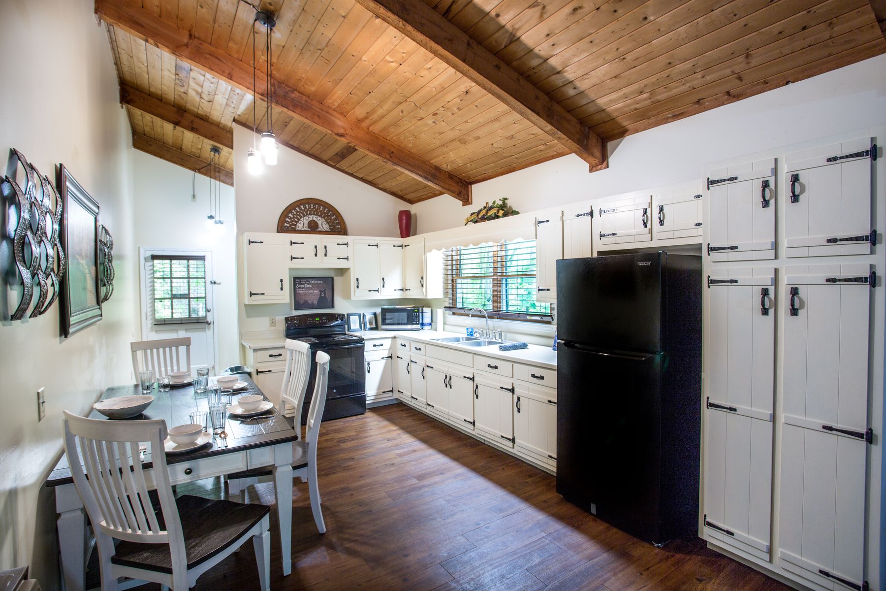 1,400 sq. ft. pet-friendly cabin with 2 king bedrooms, full kitchen, fireplace, private hot tub room, and 2.5 baths. Sleeps families or groups comfortably. Small dogs permitted. Limit 2. Advance notice and pet fees apply.