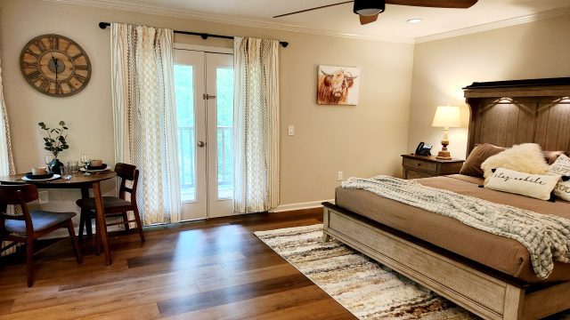 Newly renovated in July 2024, these suites offer a stylish and cozy retreat nestled in the heart of nature. Each King Junior Suite features a plush king bed, private bath, and an inviting electric fireplace—perfect for winding down after a day in the mountains. Guests enjoy added comfort with heat and air conditioning, a kitchenette, and a private balcony for enjoying the forest views. With modern touches like HBO, Showtime, free WiFi, and on-site parking, these suites strike the perfect balance between rustic tranquility and modern convenience. Wheelchair accessible. NO PETS